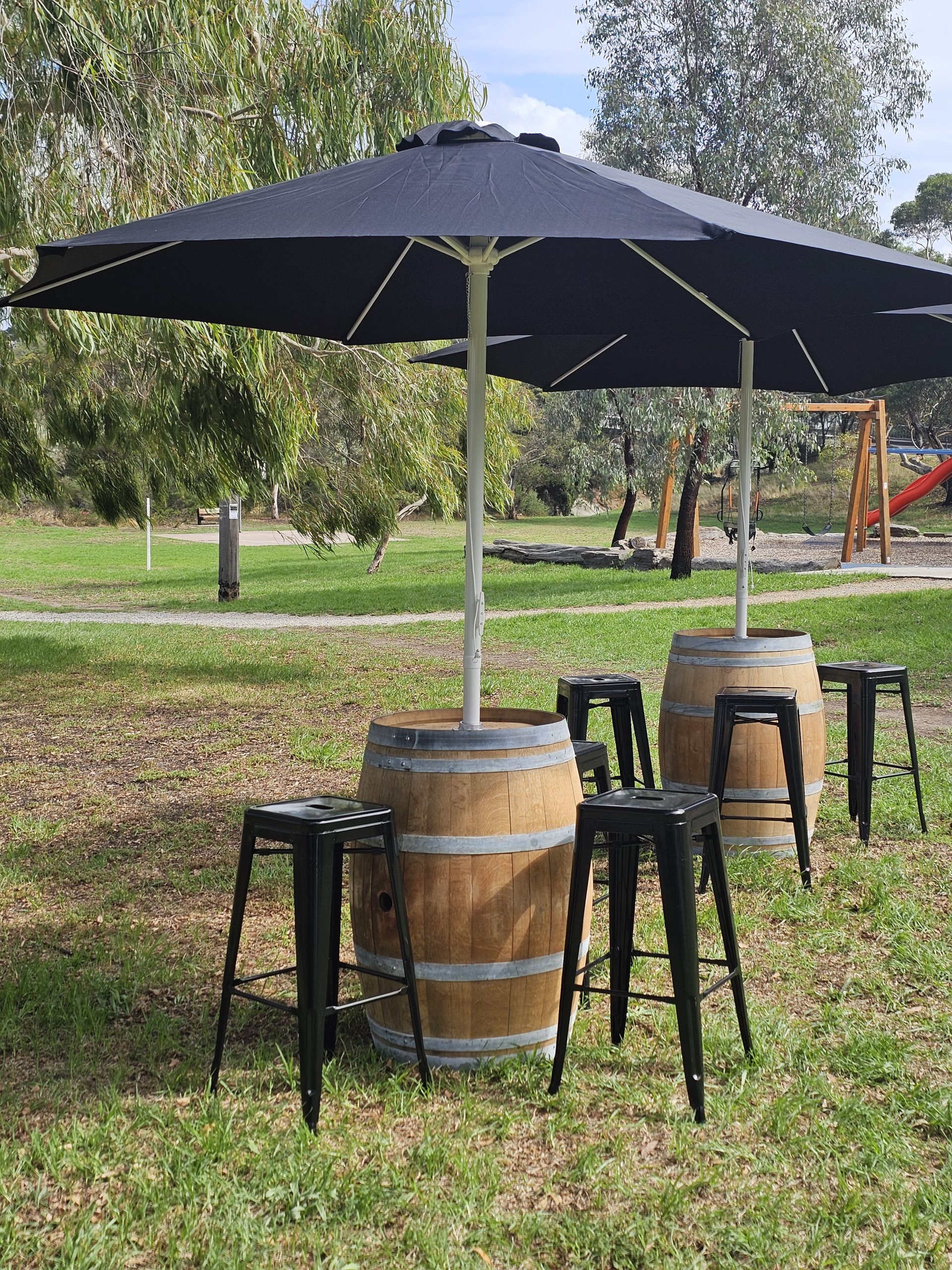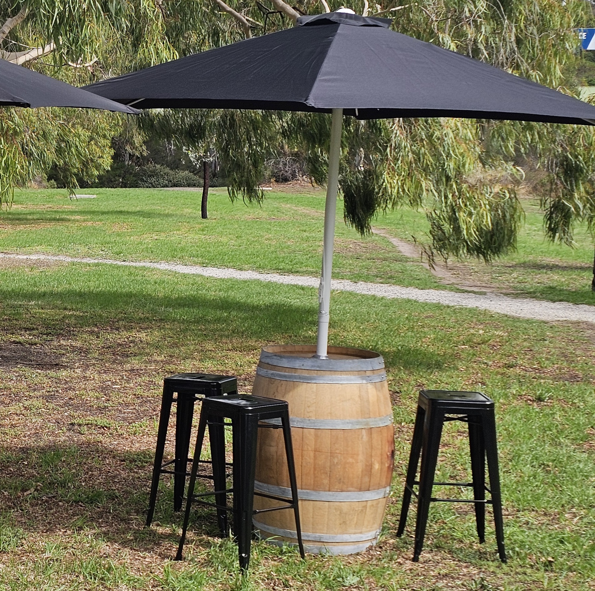 Wine Barrel and black Market Umbrella. Umbrella is 3m Wide